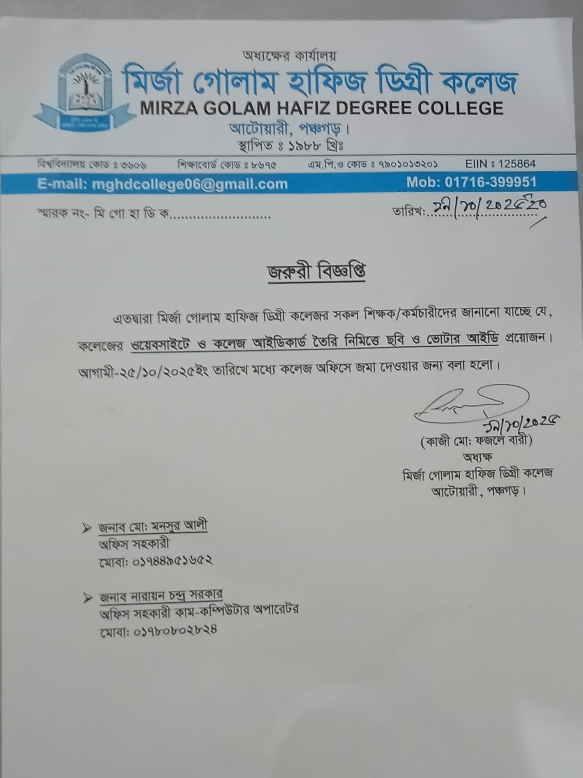 | 3 | 19 Oct, 2025 | সকল শিক্ষক/কর্মচারী জন্য ওয়েবসােইট, কলেজ আইডিকার্ড তৈরি নিমিত্তে ছবি ও ভোটার আইডি প্রসঙ্গে। | View Download |